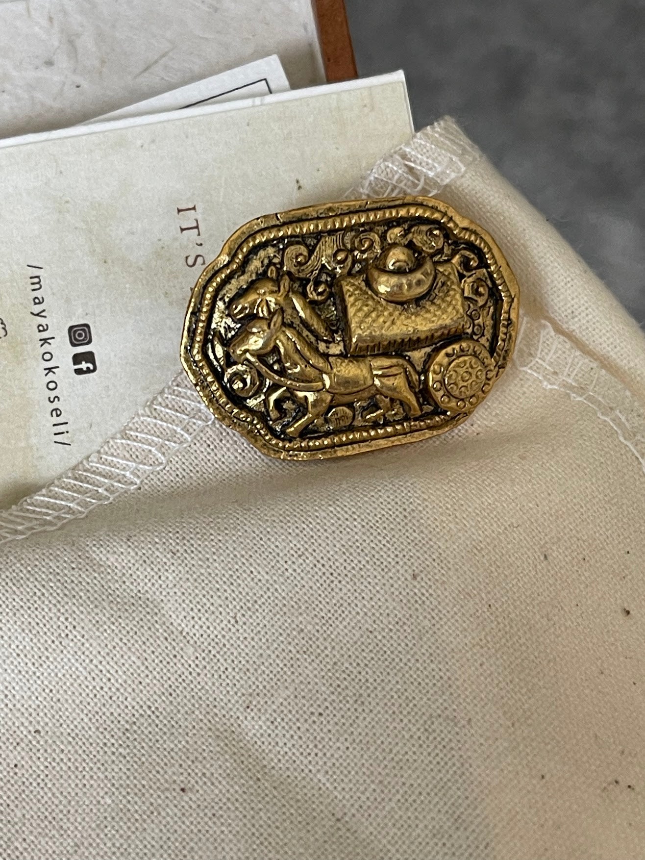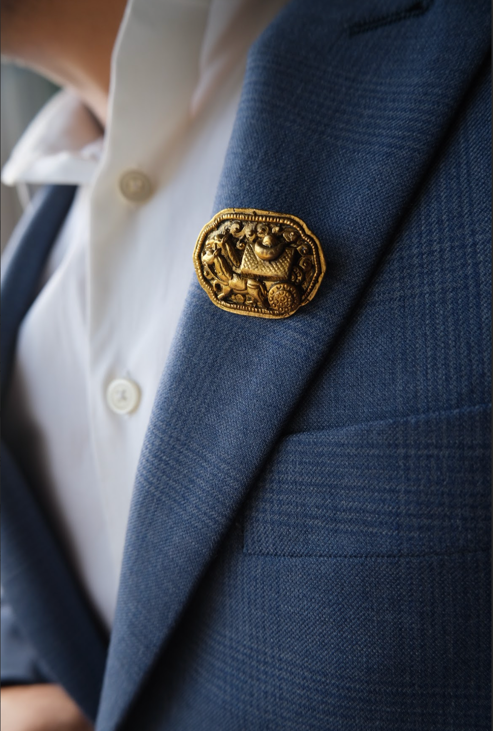 The Chariot Brooch is a contemporary reimagining of the legendary chariot from the Bhagavad Gita. Drawing inspiration from its role as a symbol of action and wisdom in the epic, this brooch represents harmony between the mind, spirit, and body. It serves as a reminder to the wearer to face life's challenges with focus, resilience, and determination.