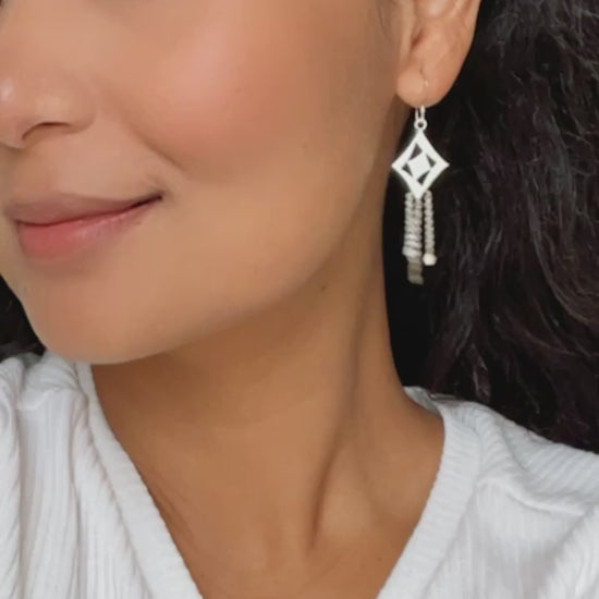 This piece is inspired by the native earrings of Tharu women called “Jimile”. Tharu is a community predominantly inhabited in the Terai(southern) region of Nepal. The main characteristic of the Tharu jewelry is that it is made of silver or silver substitutes and that is worn in great quantity.Jimile is the most popular earrings design among the Tharu. It consists of a triangular pendant with rows of chains.